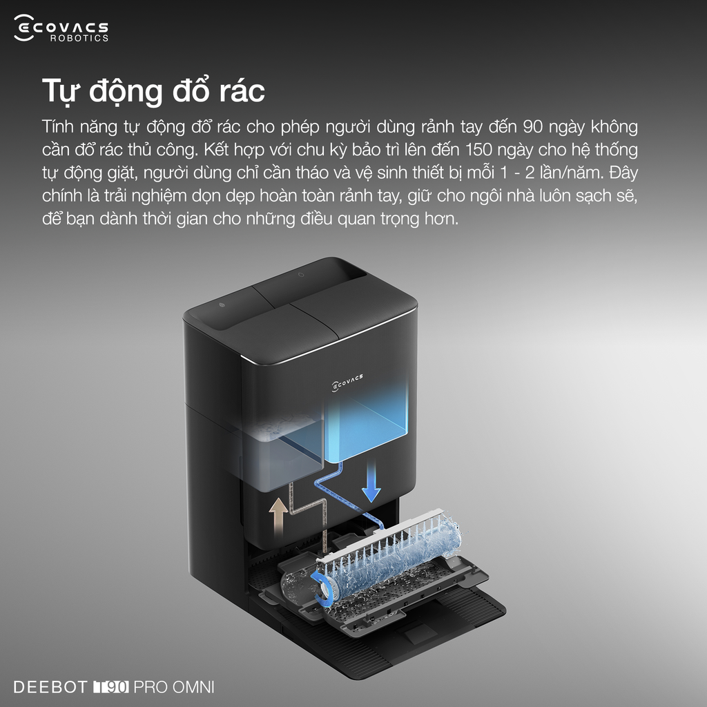 Với DEEBOT T90 PRO OMNI, việc bảo trì robot không còn là gánh nặng, công nghệ tự động đổ rác tiên tiến, cho phép bạn quên đi việc đổ rác trong suốt 90 ngày, bởi mọi bụi bẩn sẽ được tự động làm sạch khỏi hộp bụi ngay sau mỗi chu trình dọn dẹp. Đặc biệt hơn, khay giặt con lăn cũng được tối ưu hóa để có thể hoạt động bền bỉ lên đến 150 ngày mà không cần bảo dưỡng thường xuyên.