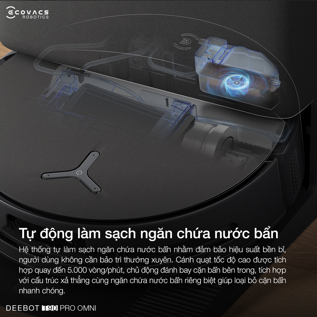 Công nghệ tự động vệ sinh hộp nước thải trên robot hút bụi lau nhà Ecovacs DEEBOT T90 PRO OMNI giúp duy trì hiệu suất vận hành bền bỉ mà không đòi hỏi người dùng phải bảo trì thường xuyên. Điểm nhấn của hệ thống là cánh quạt tích hợp có tốc độ quay cực đại lên đến 5.000 vòng/phút, cho phép chủ động đánh tan mọi cặn bẩn bám dính. Sự kết hợp giữa thiết kế thoát nước thẳng đứng và máng nước thải độc lập giúp loại bỏ bùn đất một cách nhanh chóng và triệt để.