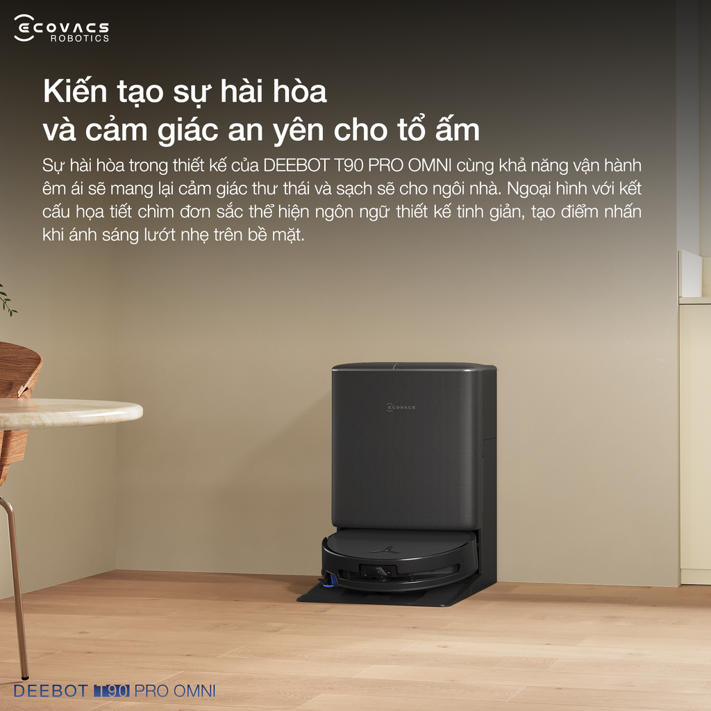 Robot hút bụi lau nhà Ecovacs DEEBOT T90 PRO OMNI là sự kết hợp hoàn hảo giữa thiết kế tối giản và công nghệ đột phá. Hiệu suất làm sạch được nâng cao với công nghệ OZMO ROLLER 3.0 tự động giặt con lăn tức thì và thiết kế chống rối ZeroTangle 4.0, giúp robot dọn dẹp không tì vết và và tuyệt đối không bị kẹt tóc. Nhờ công nghệ sạc nhanh PowerBoost độc quyền cùng thời gian vận hành bền bỉ, robot cung cấp khả năng làm sạch không gián đoạn trên các không gian có diện tích cực lớn.