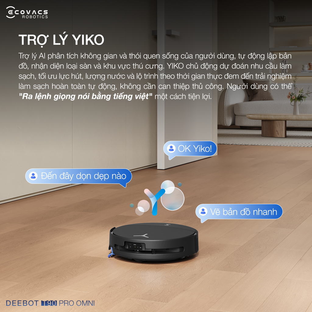 AGENT YIKO trên robot hút bụi lau nhà DEEBOT T90 PRO OMNI không chỉ là một trợ lý giọng nói thông thường mà là một hệ thống AI tự tiến hóa với khả năng suy luận logic bậc cao. Thay vì chỉ hoạt động theo lập trình sẵn có, YIKO thực hiện phân tích đa bước về thói quen sinh hoạt và cấu trúc không gian để tự động lập bản đồ, nhận diện loại sàn cũng như khu vực của vật nuôi.