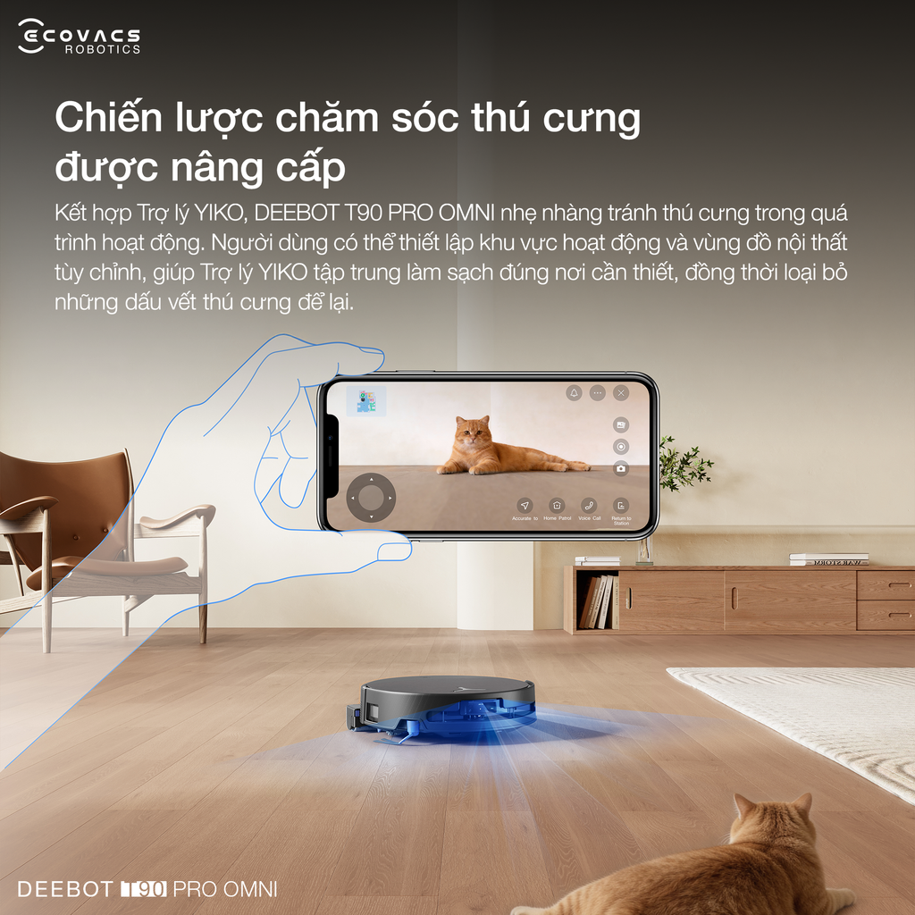 Sự kết hợp giữa AGENT YIKO và hệ thống cảm biến tân tiến đã tạo nên một giải pháp chăm sóc thú cưng đầy tinh tế. Robot hút bụi lau nhà Ecovacs DEEBOT T90 PRO OMNI có thể di chuyển nhẹ nhàng để tránh gây phiền hà cho vật nuôi. Bạn hoàn toàn có thể thiết lập các vùng làm sạch sâu chuyên biệt cho thú cưng để xử lý triệt để lông rụng hay vết bẩn, đảm bảo không gian sống luôn trong lành và hài hòa cho cả gia đình.
