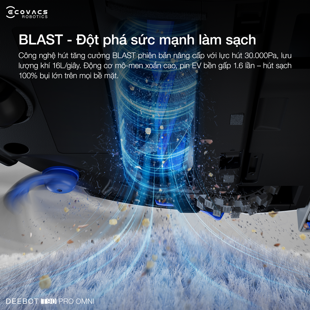 DEEBOT T90 PRO OMNI đột phá lực hút 30.000Pa nhờ công nghệ hút tăng cường BLAST