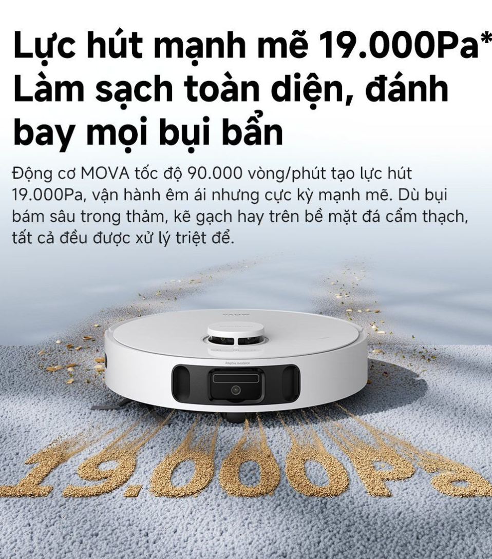 Mova E40 Ultra sử dụng động cơ tốc độ cao 90.000 vòng/phút, tạo ra lực hút ấn tượng 19.000Pa. Nhờ đó, robot dễ dàng hút sạch bụi mịn, mảnh vụn lớn và lông thú cưng, đồng thời vận hành êm ái, không gây ồn ào ảnh hưởng đến sinh hoạt hàng ngày.