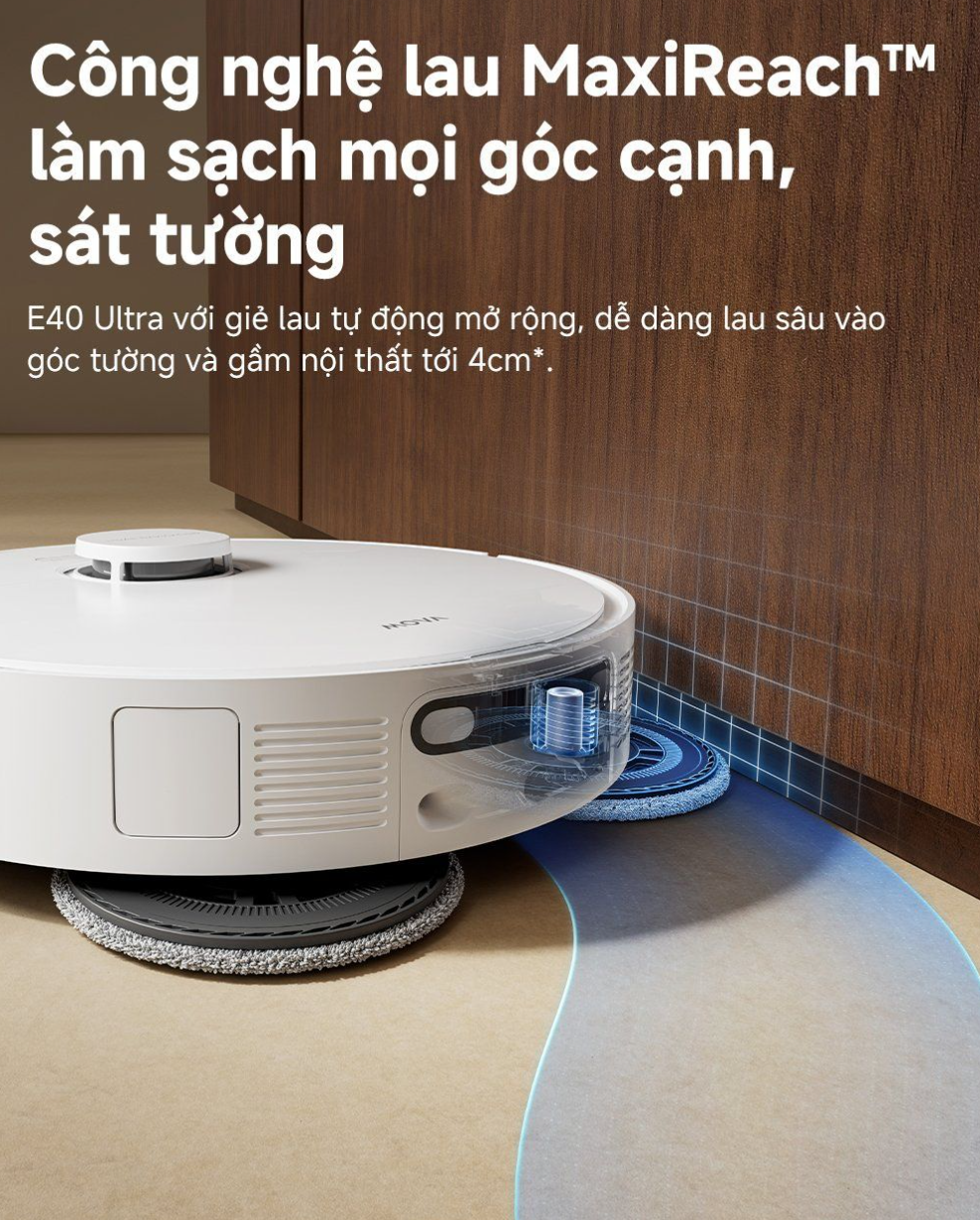 Khác biệt so với nhiều dòng robot thông thường, MaxiReach™ trên E40 Ultra giúp giẻ lau tiếp cận sát tường và các góc cạnh, đảm bảo không bỏ sót bụi bẩn. Đây là điểm cộng lớn cho những ngôi nhà nhiều góc hẹp hoặc khu vực khó tiếp cận.