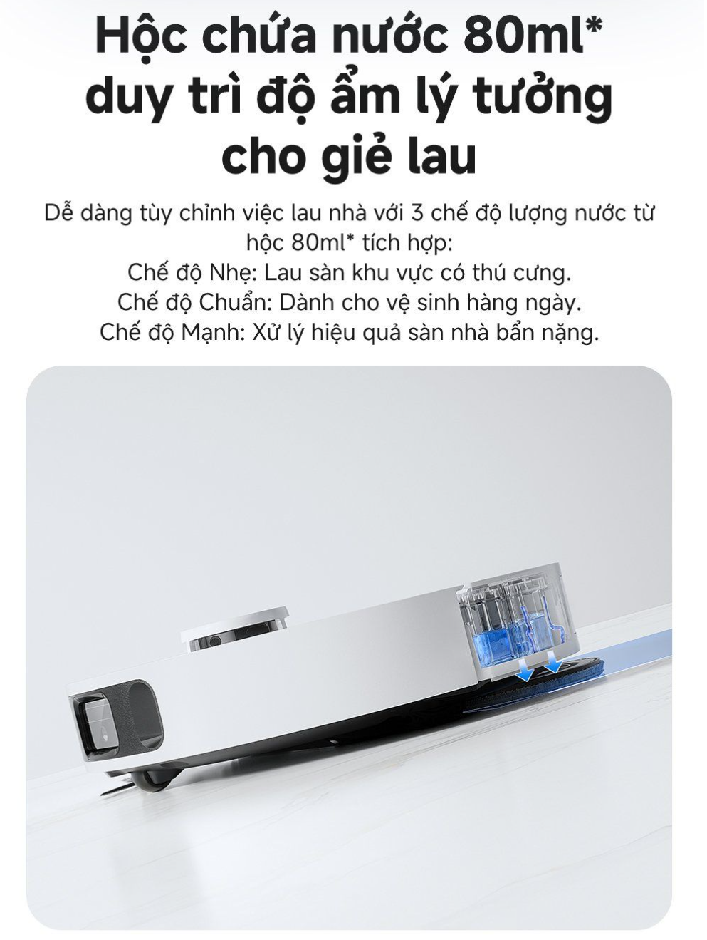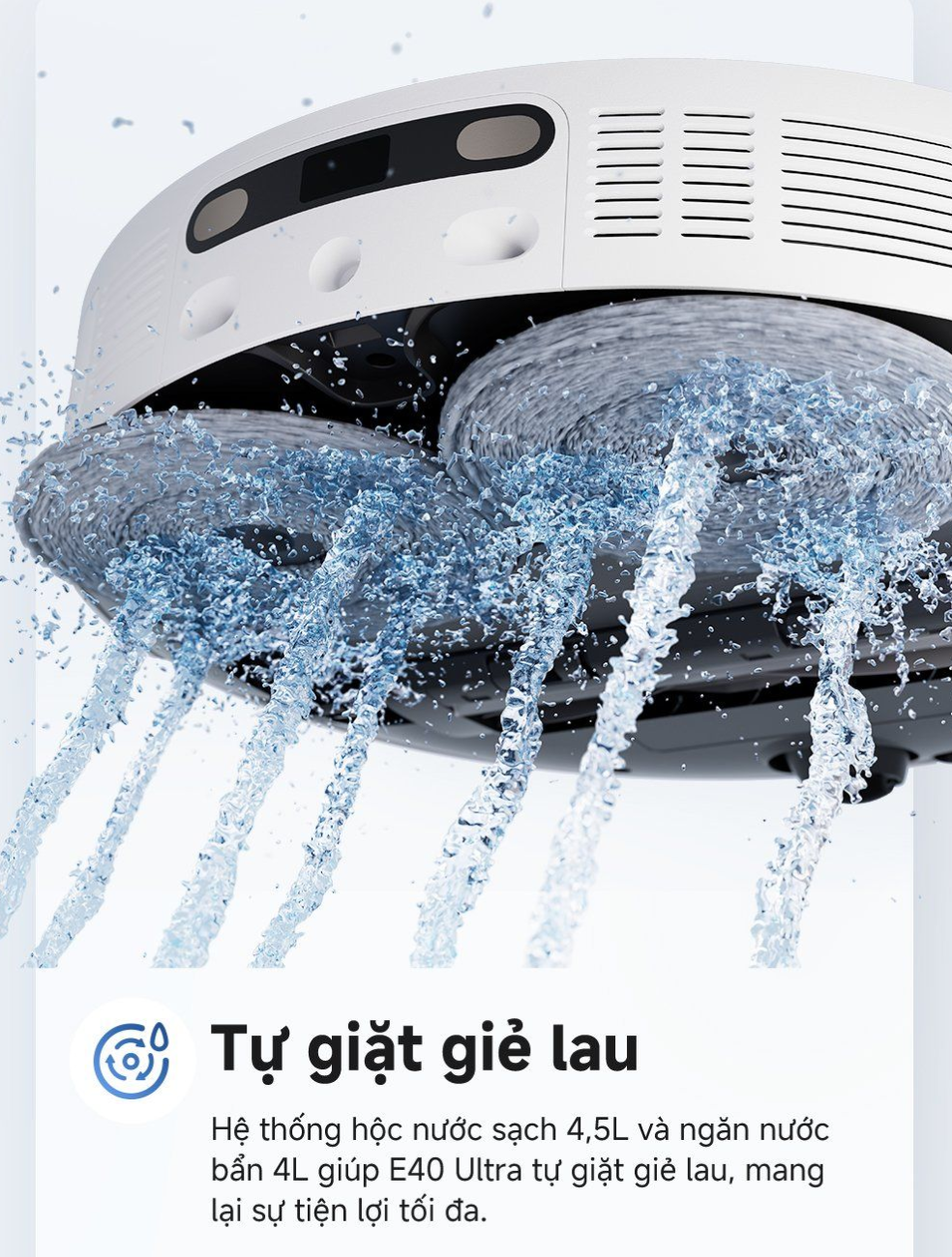 Robot được tích hợp hộc nước sạch 4,5L và ngăn nước bẩn 4L, cho phép tự giặt giẻ lau sau mỗi chu trình làm việc. Đặc biệt, chức năng sấy khô giẻ lau bằng khí nóng giúp loại bỏ mùi khó chịu và ngăn ngừa vi khuẩn, nấm mốc phát triển.