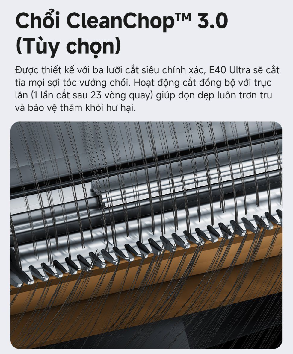 Mova E40 Ultra sở hữu chổi cạnh nghiêng 45° bằng cao su giúp chủ động gỡ tóc và sợi vải, hạn chế tối đa tình trạng rối chổi. Ngoài ra, với chổi CleanChop™ 3.0 (tùy chọn), robot có khả năng cắt tỉa tóc cuốn vào chổi bằng lưỡi cắt siêu chính xác, giữ hiệu suất hoạt động ổn định.