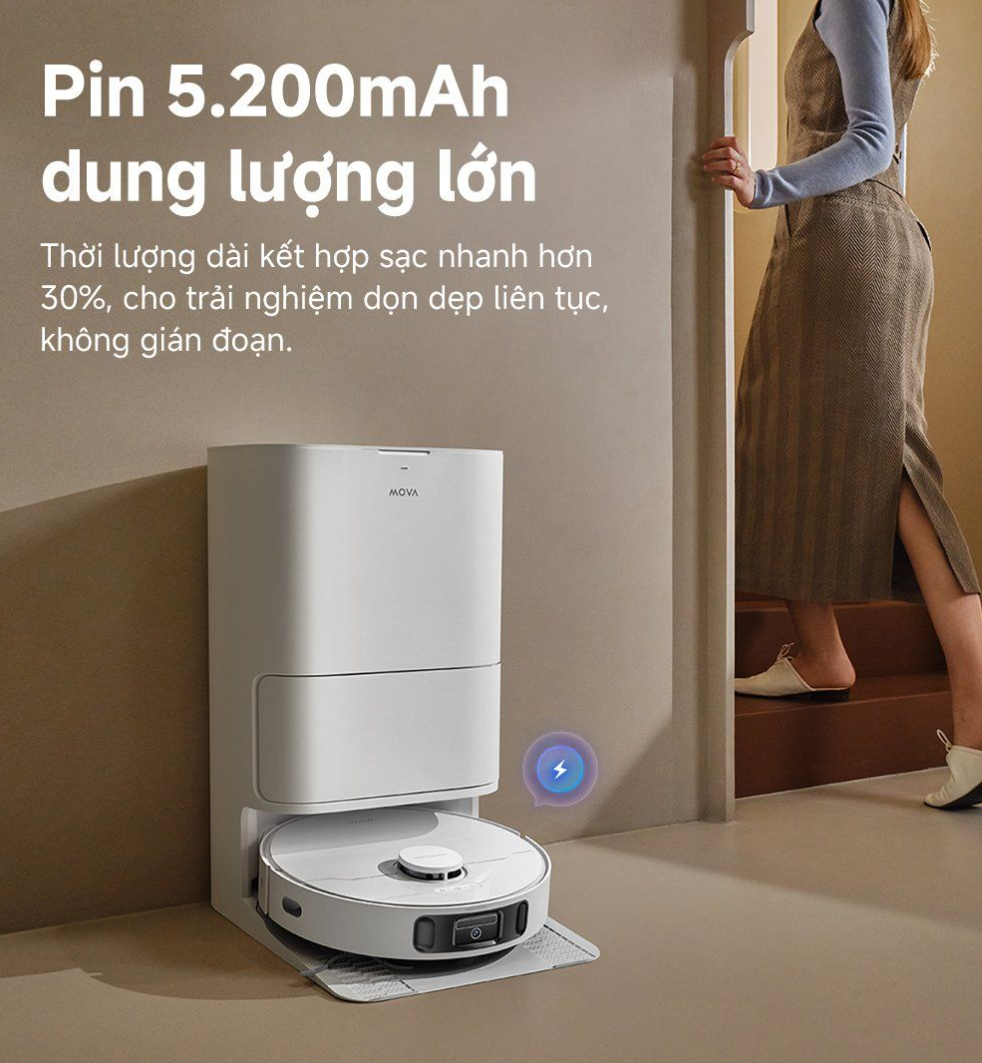 Trang bị viên pin dung lượng 5.200mAh, Mova E40 Ultra hoạt động liên tục trên diện tích rộng mà không gián đoạn. Công nghệ sạc nhanh cải tiến nhanh hơn 30%, rút ngắn thời gian chờ đợi và đảm bảo robot luôn sẵn sàng cho lần dọn dẹp tiếp theo.