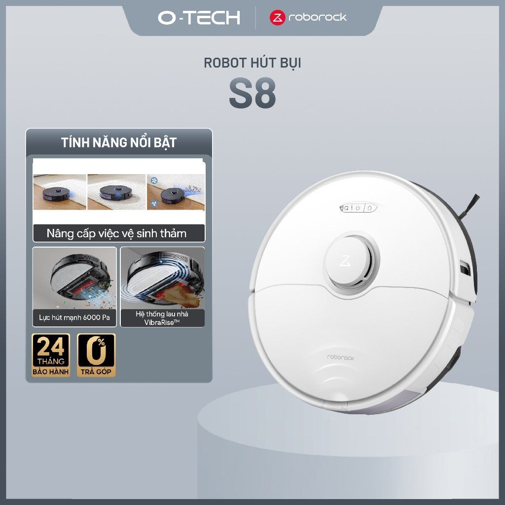 Robot hút bụi lau nhà Roborock S8 là thiết bị vệ sinh thông minh nổi bật với lực hút mạnh mẽ lên đến 6.000 Pa và công nghệ lau rung sonic tiên tiến giúp chà sạch các vết bẩn cứng đầu, mang lại sàn nhà sáng bóng. Robot được trang bị hệ thống định vị PreciSense® LiDAR và cảm biến vật cản laser Reactive 3D, giúp di chuyển linh hoạt, nhận diện và tránh vật thể chính xác trong quá trình làm sạch. Với dung lượng pin 5.200 mAh, Roborock S8 có thể làm sạch liên tục đến 300 m², đồng thời hỗ trợ lưu trữ bản đồ đa tầng và điều khiển qua ứng dụng Roborock tiện lợi.