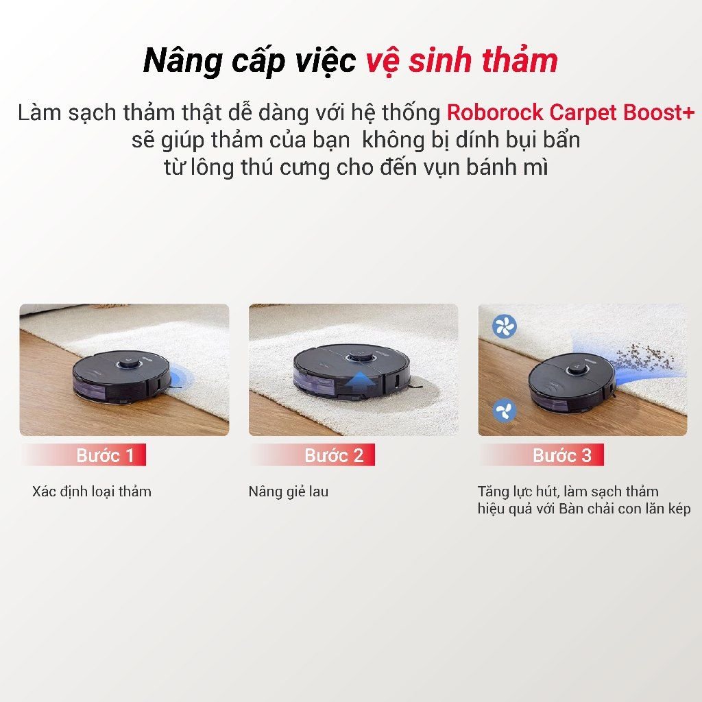 Khi làm việc trên thảm hoặc các bề mặt khác, robot tự động nâng chổi và khăn lau lên để tăng lực hút tối đa và tránh làm ướt thảm, đồng thời hút theo đường zic-zắc để làm sạch hiệu quả hơn.