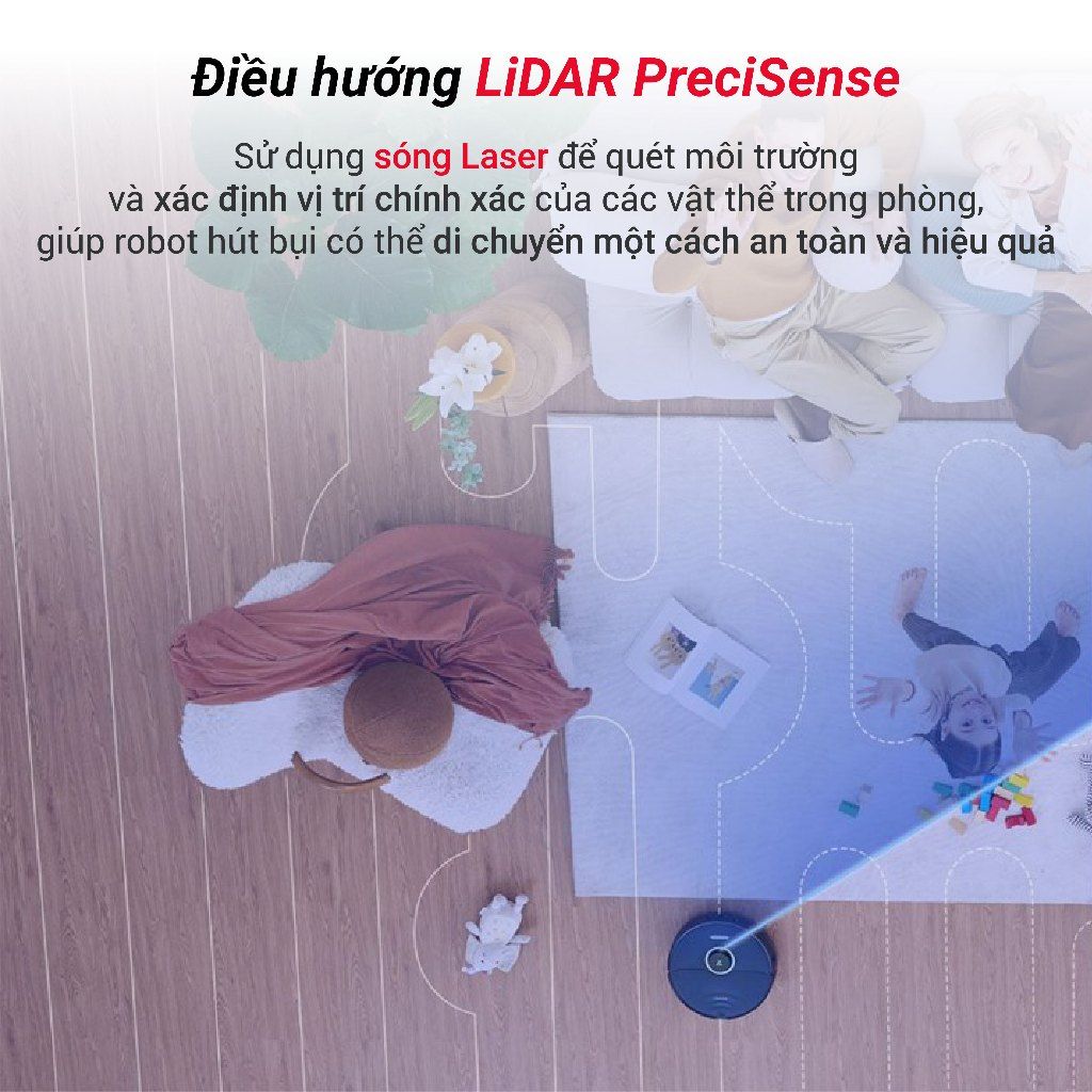 Công nghệ định vị bằng sóng laser giúp robot quét và tạo bản đồ chính xác, đồng thời cảm biến laser nhận diện và tránh được đến 42 vật thể khác nhau, giúp di chuyển thông minh và an toàn.