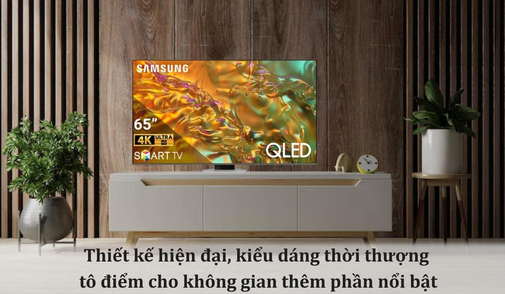 Smart Tivi 65 inch QLED 4K Samsung QA65Q80DAKXXV có thiết kế hiện đại thu hút mọi ánh nhìn với đường viền mỏng thanh thoát cùng chân đế vững chắc giúp cố định tivi trên mặt phẳng. Với kích thước màn hình 55 inch tivi phù hợp cho những không gian có diện tích vừa và nhỏ như phòng khách, phòng ngủ,... từ đó tạo nên một tổng thể liền mạch, hài hòa trong không gian nhà bạn.
