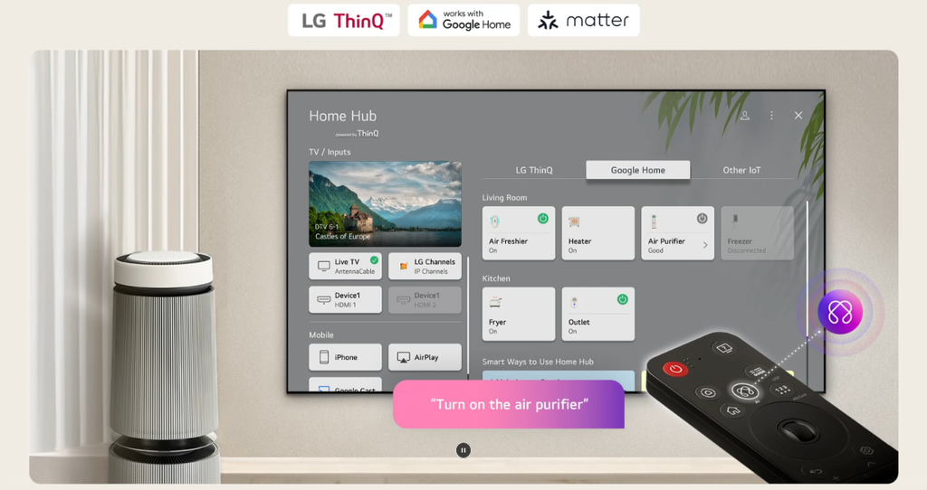 *LG hỗ trợ thiết bị Wi-Fi đạt chuẩn “Matter”. Tính năng và dịch vụ có hỗ trợ 'Matter' có thể thay đổi tùy theo thiết bị được kết nối. Kết nối ban đầu giữa ThinQ và Matter phải được thực hiện thông qua ứng dụng di động ThinQ.