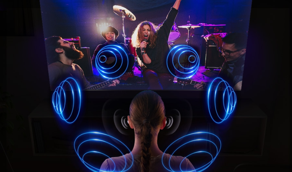 - Công nghệ âm thanh OTS+ kết hợp Dolby Atmos với loa 70W 4.2.2.ch: Sử dụng hệ thống loa đa kênh được bố trí xung quanh màn hình tivi, phân tích chuyển động của các đối tượng trên màn hình và điều chỉnh âm thanh phát ra từ các loa tương ứng. Nhờ đó, âm thanh sẽ di chuyển theo đúng vị trí của đối tượng, tạo ra hiệu ứng âm thanh vòm 3D chân thực.