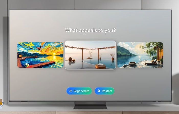 Thiết kế hình nền bằng AI: Đây là một tính năng vô cùng thông minh, tiện lợi. Theo đó tivi có khả năng tự động tạo ra những hình ảnh độc đáo từ các lựa chọn từ khóa cho giao diện màn hình mong muốn để thay đổi bầu không khí theo phong cách riêng của bạn.