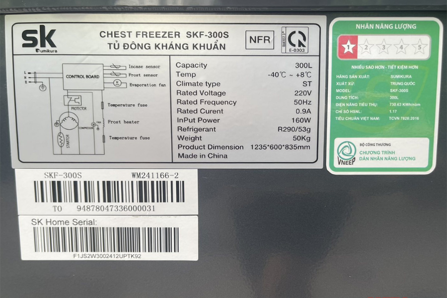 SKF-300S/NFR thiết kế kiểu dáng nằm ngang, có 1 ngăn đông với 1 cánh đóng mở. Tủ đông có kích thước là 1.235 x 600 x 835 mm (dài x sâu x cao) sẽ không chiếm nhiều diện tích đặt tủ.