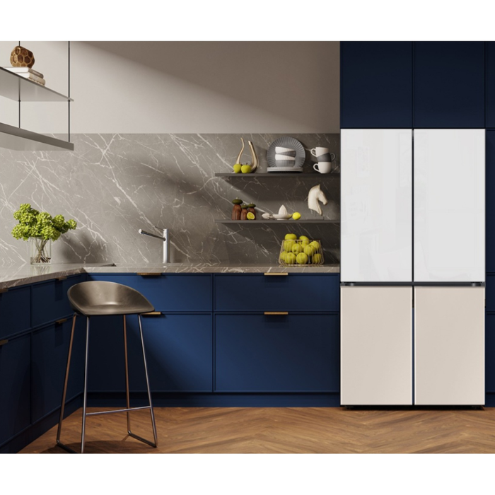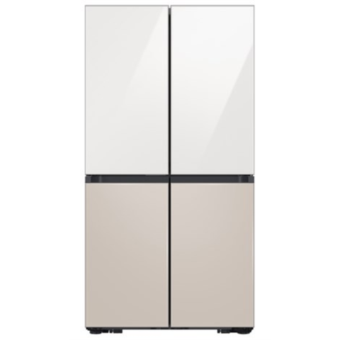 Tủ lạnh sở hữu thiết kế 4 cửa phẳng, mặt kính Bespoke bóng bẩy, chịu lực tốt, bền bỉ theo thời gian và dễ dàng vệ sinh. Màu sắc trắng thạch anh phối cùng nâu be tạo nên vẻ ngoài tinh tế, phù hợp với nhiều phong cách nội thất.