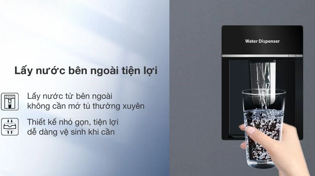 - Lấy nước bên ngoài cho phép bạn lấy nước mà không cần phải mở cửa tủ, đồng thời tránh hơi lạnh thất thoát ra ngoài, góp phần tiết kiệm điện năng.