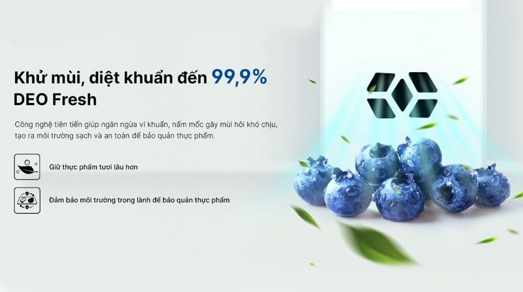 Công nghệ Deo Fresh: Có khả năng diệt khuẩn đến 99.9% và khử mùi hiệu quả, tạo ra môi trường bên trong tủ lạnh luôn được sạch sẽ để bảo quản thực phẩm và góp phần làm cho thực phẩm giữ được độ tươi lâu đáng kể.