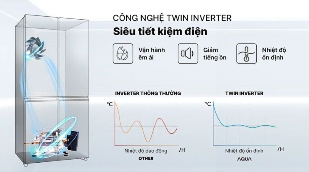 - Tủ lạnh Aqua Inverter sử dụng công nghệ Twin Inverter với cơ chế máy nén Inverter tự động điều chỉnh tốc độ phù hợp với khối lượng thực phẩm trong tủ, kết hợp cùng quạt Inverter thổi luồng khí lạnh lan tỏa chuẩn xác, cho khả năng vận hành êm ái và tiết kiệm hiệu quả.