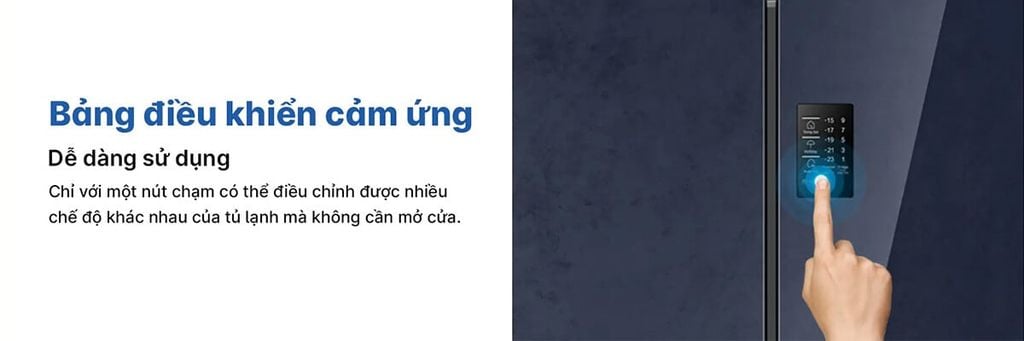 Bảng điều khiển cảm ứng cho phép người dùng chỉ cần một nút chạm có thể điều chỉnh nhiều chế độ khác nhau mà không cần mở tủ. Tính năng này giúp việc sử dụng tủ lạnh Aqua trở nên đơn giản và linh hoạt hơn, hạn chế sự thất thoát hơi lạnh.Bảng điều khiển cảm ứng