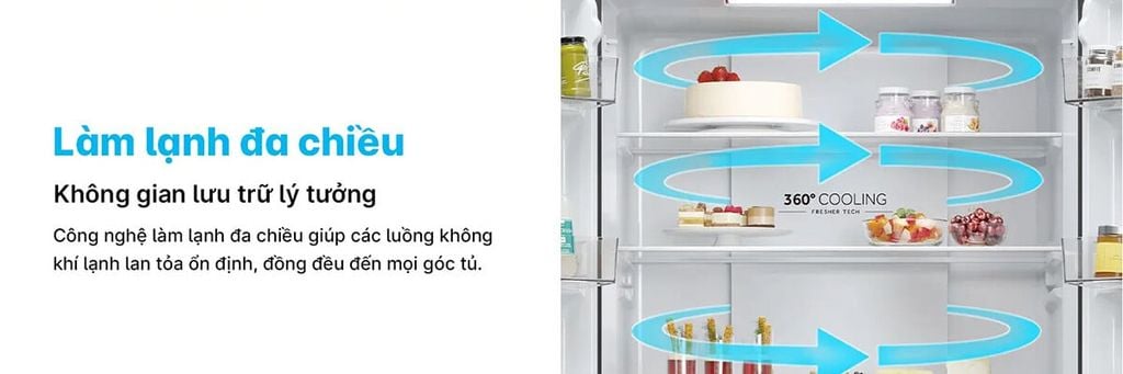 Công nghệ làm lạnh đa chiều tạo ra các luồng không khí lạnh phân tán đều và ổn định trong mọi góc của tủ. Cơ chế làm lạnh này giúp thực phẩm trong tủ lạnh sẽ được bảo quản hiệu quả và lâu hơn.Công nghệ làm lạnh đa chiều