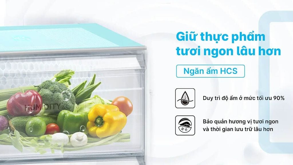 Ngăn ẩm HCS giữ cho thực phẩm được bảo quản tươi lâu hơn bằng cách duy trì độ ẩm ở mức tối ưu. Ngăn này giúp bảo quản được hương vị tự nhiên của thực phẩm và kéo dài thời gian lưu trữ.Ngăn ẩm HCS giữ thực phẩm tươi lâu hơn