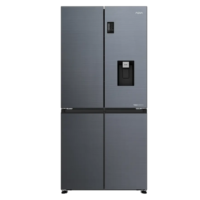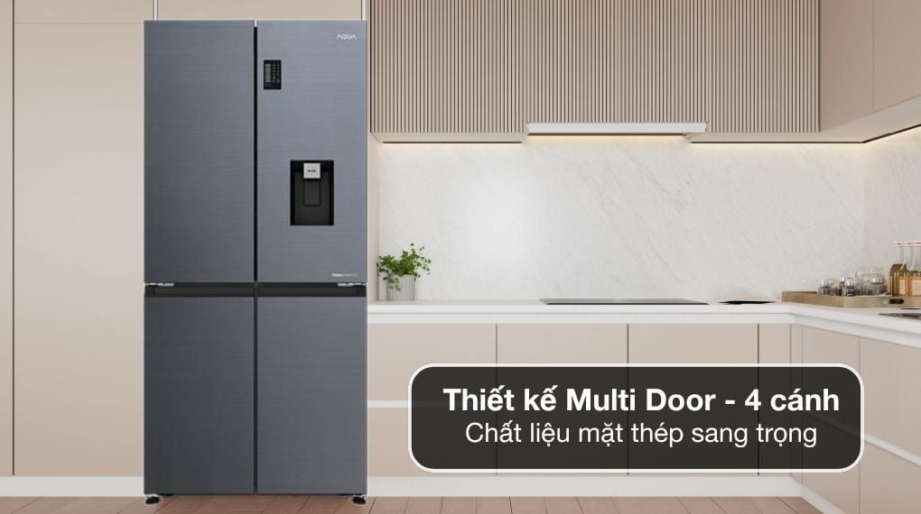 - Tủ lạnh Aqua được thiết kế dạng Multi Door 4 cánh với mặt thép thời thượng, mang lại vẻ ngoài tinh tế, phù hợp nhiều không gian bếp hiện đại.
