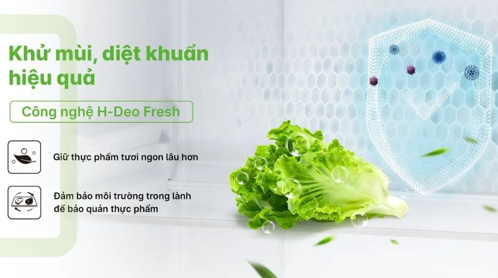 - Tủ lạnh sử dụng công nghệ kháng khuẩn khử mùi H-DEO Fresh, giúp loại bỏ vi khuẩn và mùi hôi hiệu quả, bảo vệ chất lượng thực phẩm lưu trữ.