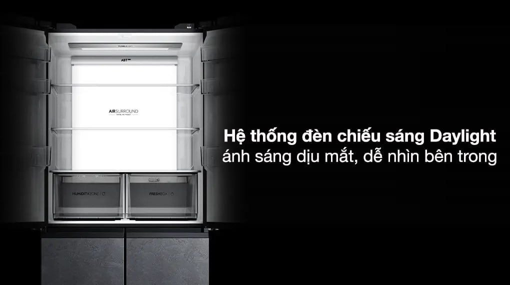 - Hệ thống đèn chiếu sáng Daylight: từ từ tạo ra ánh sáng tự nhiên dịu nhẹ, không gây chói mắt, cho bạn đặt vào, lấy ra hoặc tìm kiếm các thực phẩm trong tủ với khả năng nhìn thoải mái, dễ chịu.