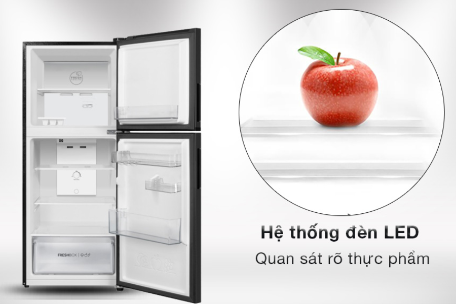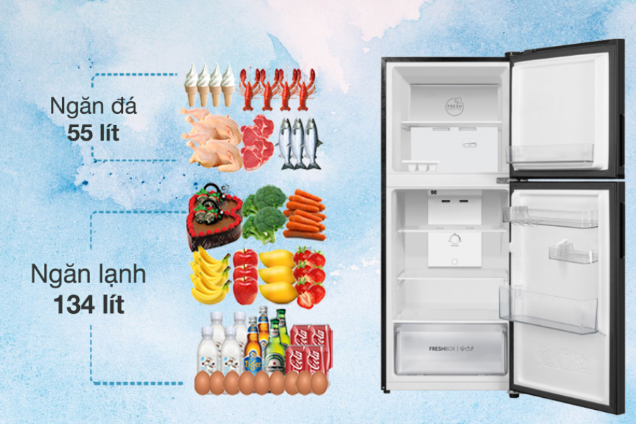Ngăn lạnh có dung tích 134 lít, gồm có kệ chia làm các ngăn và hộc đựng rau củ quả. Ngoài ra, cánh cửa tủ còn được thiết kế thêm 3 khay chứa tiện lợi cho việc đặt đồ hộp và các loại đồ uống.