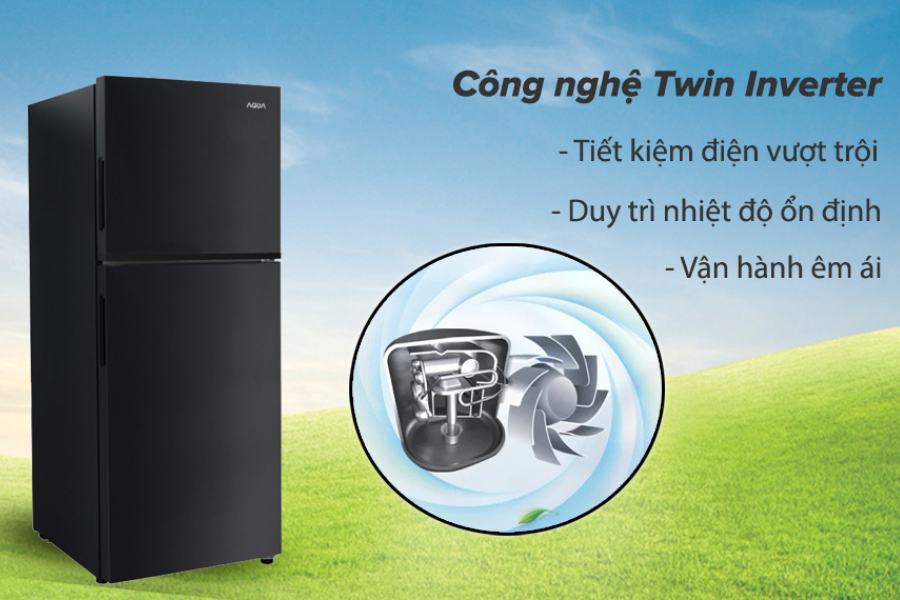 Tủ lạnh Aqua 189 lít này sử dụng công nghệ Twin Inverter, kết hợp máy nén Inverter và quạt Inverter để duy trì nhiệt độ ổn định bên trong các ngăn tủ lạnh, đồng thời còn mang lại hiệu quả tiết kiệm điện và vận hành êm ái hơn.