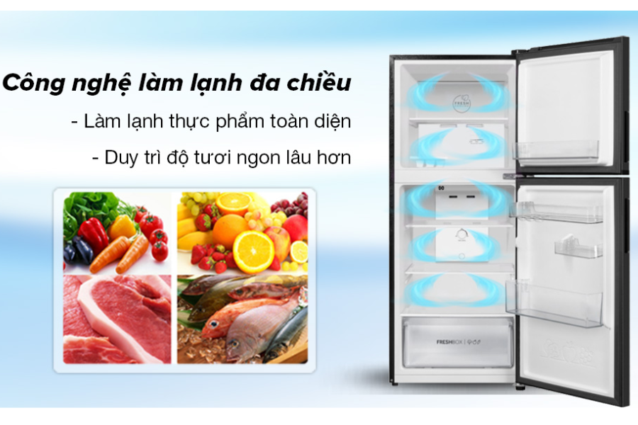 Công nghệ làm lạnh đa chiều: Giúp hơi lạnh tỏa đều bên trong mỗi ngăn và phủ đều trên thực phẩm, nhờ đó mà thực phẩm giữ được độ tươi ngon cũng như tránh được hiện tượng hơi lạnh không đồng đều gây hỏng thực phẩm.