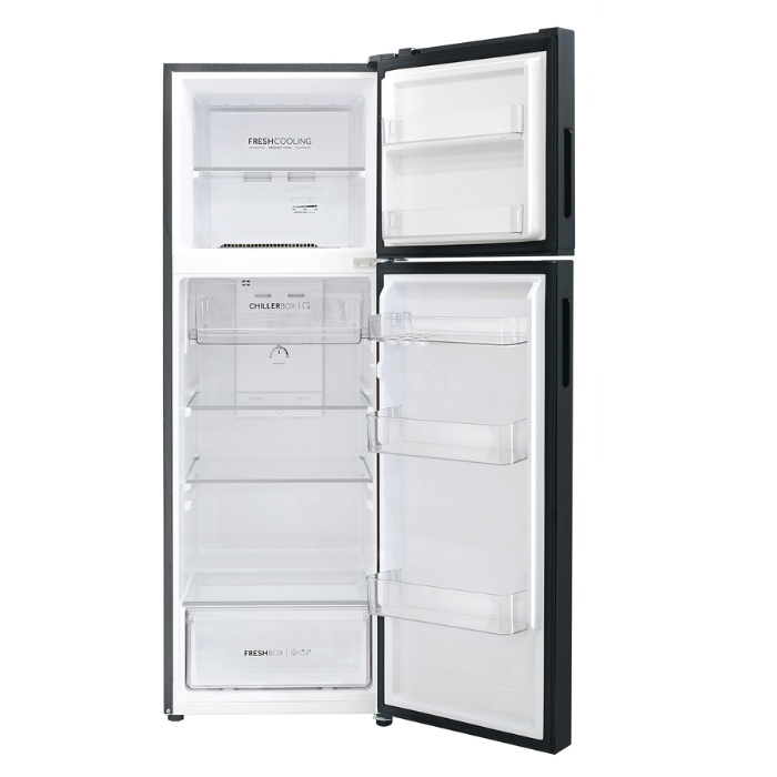 - Chiếc tủ lạnh này có kiểu dáng 2 cánh với ngăn đá trên, lớp vỏ bên ngoài được phủ một màu đen xám khói nhẹ nhàng tăng thêm nét sang trọng và tinh tế trong không gian nội thất.