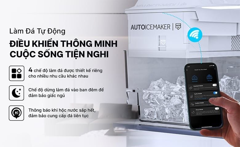 Ngoài ra, tủ lạnh còn tích hợp chế độ thông báo khi hộc nước sắp hết, đảm bảo quá trình làm đá không bị gián đoạn. Đặc biệt, chế độ dừng làm đá vào ban đêm giúp giữ không gian yên tĩnh, đảm bảo giấc ngủ ngon cho cả gia đình.