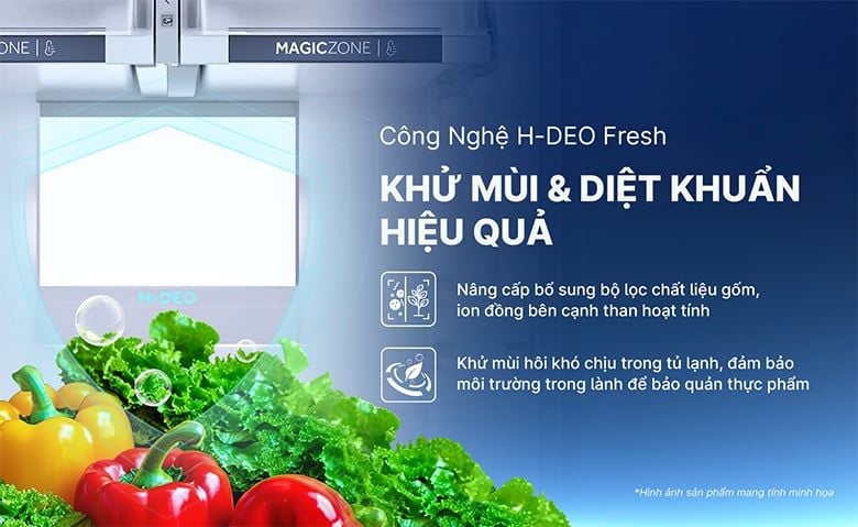 Công nghệ H - DEO ứng dụng các phân tử ion bạc (Ag+) để tiêu diệt vi khuẩn và ngăn chặn sự phát triển của chúng, đồng thời loại bỏ mùi hôi khó chịu do thực phẩm gây ra. Nhờ đó, thực phẩm được bảo quản trong môi trường an toàn, giữ trọn độ tươi ngon mà không bị lẫn mùi, mang đến sự yên tâm và bảo vệ sức khỏe cho người dùng.