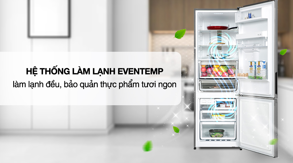 - Hệ thống làm lạnh EvenTemp của tủ lạnh đảm bảo nhiệt độ đồng đều giữa các ngăn, giúp kéo dài thời gian bảo quản thực phẩm lâu hơn.