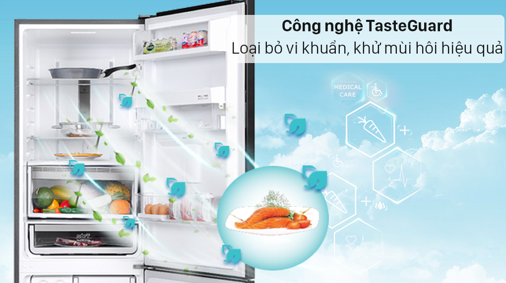 Nhờ sử dụng bộ lọc than hoạt tính của công nghệ TasteGuard mà các loại mùi hôi từ thực phẩm sẽ được loại bỏ tối ưu cũng như ức chế được sự hoạt động của một số vi khuẩn, giúp cho không khí bên trong tủ lạnh luôn sạch sẽ và mang lại cảm giác dễ chịu cho bạn mỗi khi mở cửa tủ.