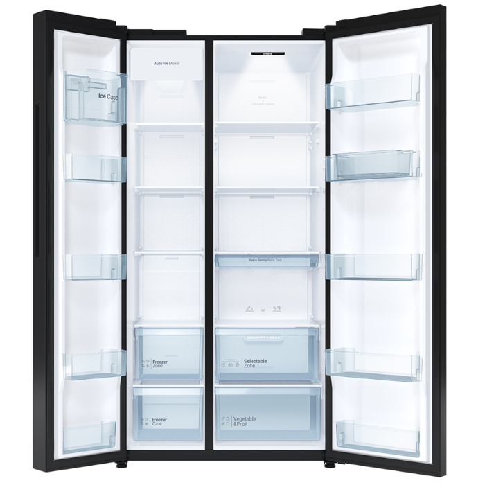 Sản phẩm sở hữu thiết kế 2 cửa mở ngang đặc trưng của dòng Side by Side, mang lại sự tiện lợi khi sử dụng và tối ưu không gian lưu trữ. Với dung tích lên đến 653 lít, trong đó ngăn lạnh chiếm khoảng 411 lít và ngăn đông 242 lít, tủ đáp ứng tốt nhu cầu bảo quản thực phẩm cho gia đình đông thành viên. Màu đen ánh sao (Black Sapphire) tạo điểm nhấn cao cấp, dễ dàng phối hợp với nhiều không gian bếp hiện đại.