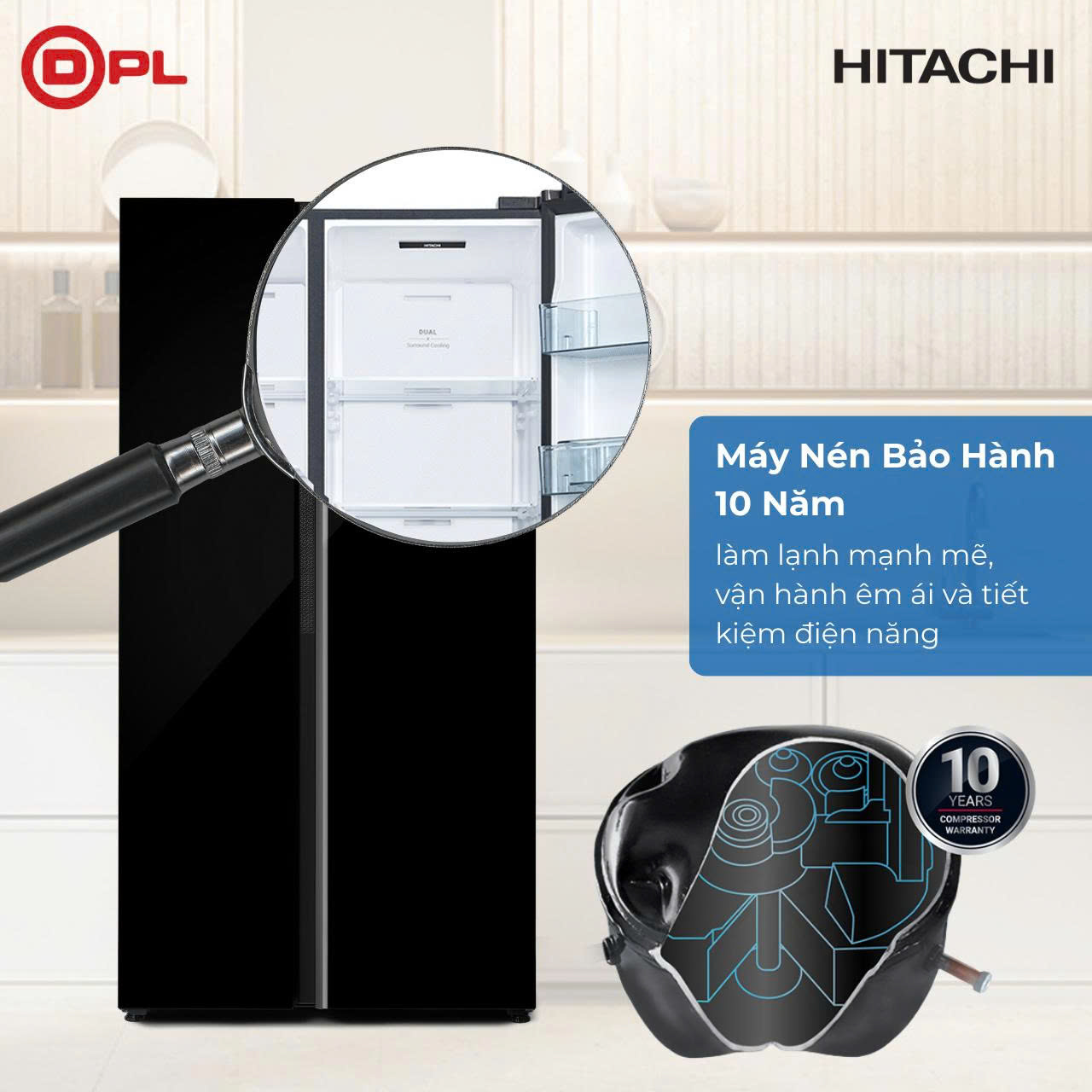 Công nghệ Inverter sử dụng máy nén có khả năng điều chỉnh nhiệt độ linh hoạt theo nhiều cấp độ tùy thuộc vào các điều kiện bên trong và bên ngoài tủ giúp làm lạnh mạnh mẽ ngay cả khi ở mức năng lượng thấp, tạo luồng khí nhẹ nhàng duy trì độ tươi ngon mà không gây đóng tuyết. Máy nén Inverter của tủ lạnh Hitachi mang lại hiệu suất vượt trội, được kiểm soát điện tử chính xác giúp tiết kiệm năng lượng tối ưu. Nhờ đó, tủ lạnh Hitachi HRSN9713ESGBKVN được duy trì nhiệt độ ổn định, vận hành êm ái, bền bỉ.