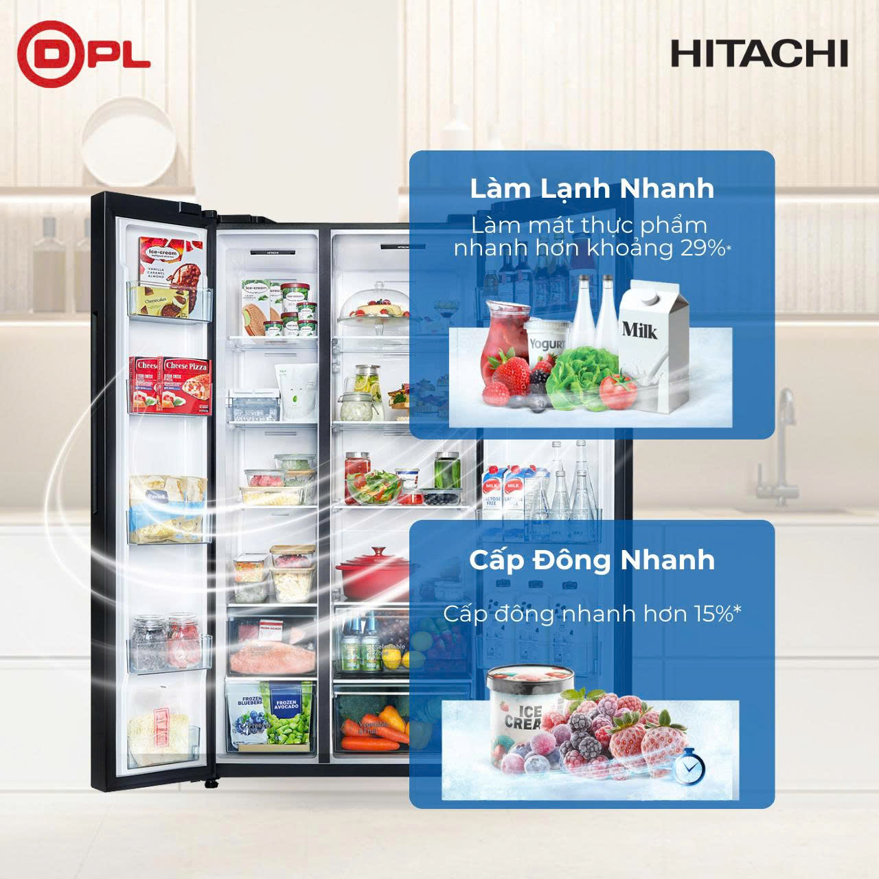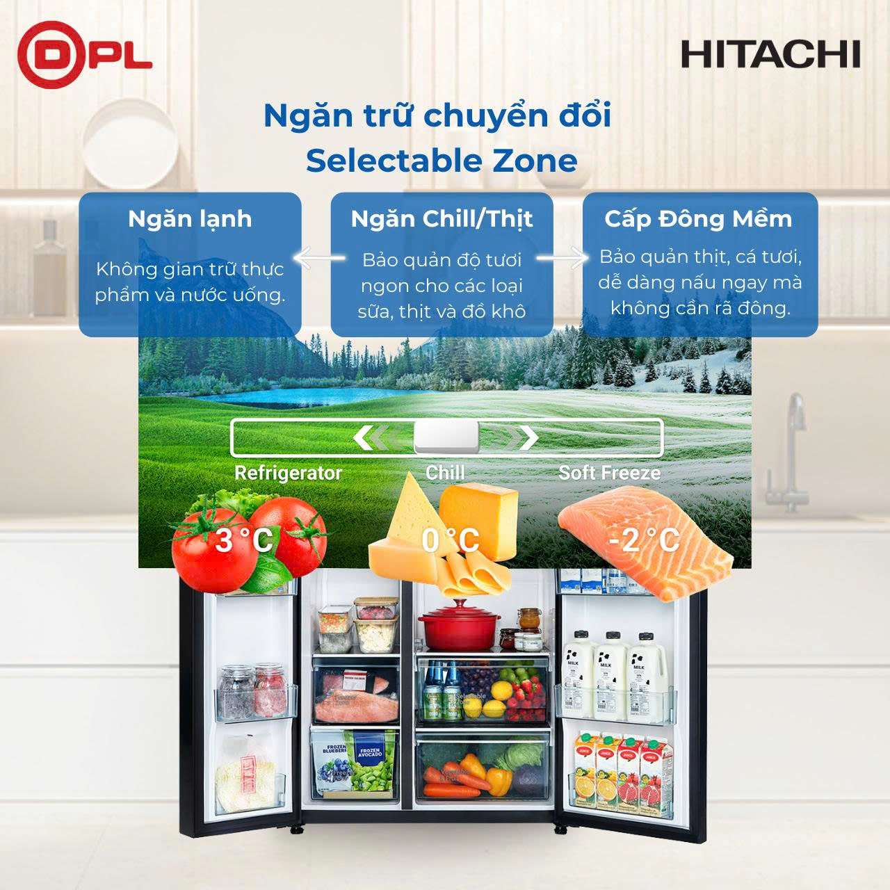 Bảo quản độ tươi ngon cho các loại sữa, thịt và đồ khô bằng cách bảo quản chúng ở nhiệt độ tối ưu 0°C (±2°C) trong ngăn Selectable Zone.