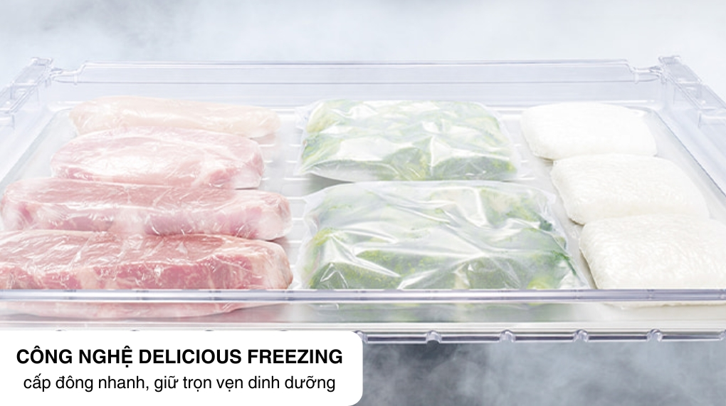 - Công nghệ cấp đông tươi ngon Delicious Freezing giúp đông lạnh thực phẩm nhanh chóng mà vẫn giữ trọn vẹn dinh dưỡng nhờ khay nhôm lớn dẫn nhiệt tốt hơn. Đồng thời, ngăn chặn sự phát triển của băng, tránh làm hỏng các tế bào thực phẩm. Bên cạnh đó, hệ thống cảm biến nhiệt độ tự động nhận biết thực phẩm nóng và di chuyển luồng khí lạnh đến đúng vị trí để cấp đông nhanh, giữ lại dinh dưỡng và độ tươi ngon của thực phẩm trong quá trình bảo quản.