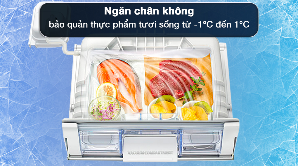 - Ngăn chân không Vacuum Compartment với cấu trúc ngăn trữ hoàn toàn kín khí, chịu được áp suất ở ngưỡng 0,8 atm (áp suất khí quyển) nhờ máy bơm chân không hút không khí và giảm lượng oxy hóa của thực phẩm trong suốt quá trình sử dụng.