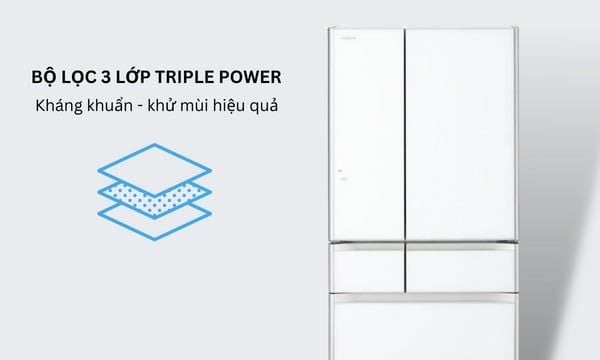 Bộ lọc Triple Power 3 lớp giúp loại bỏ hiệu quả đến 99% các phần tử gây mùi khó chịu, đồng thời giúp kháng khuẩn để không khí trong tủ luôn trong lành, thực phẩm không bị lẫn mùi lẫn nhau.