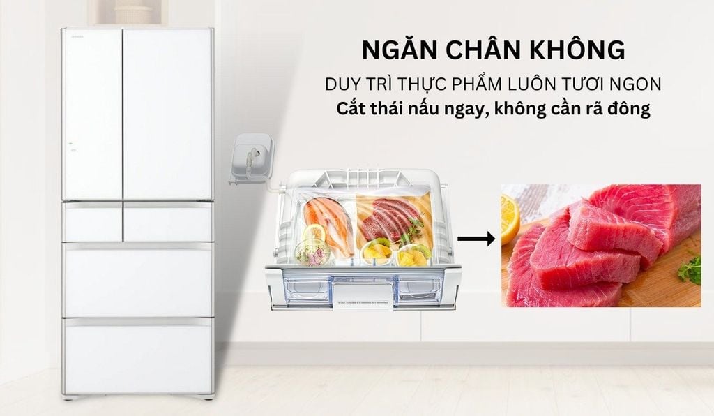 Bí quyết để bảo quản thực phẩm tươi ngon lâu dài là làm giảm lượng oxy nhằm hạn chế tối đa quá trình oxy hóa gây mất chất diễn ra. Tủ lạnh Hitachi R-WX620KV (XW) tích hợp Ngăn Chân Không sử dụng máy bơm chân không để hút tách không khí, giảm lượng oxy để ngăn trữ hoàn toàn kín, duy trì môi trường áp suất ở ngưỡng 0.8 atm (áp suất khí quyển). Nhờ đó thịt, cá và các sản phẩm từ sữa giữ được sự tươi ngon và dinh dưỡng vốn có, sẵn sàng chế biến ngay mà không cần chờ rã đông, dễ dàng cắt thái, tẩm ướp gia vị.