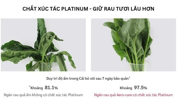 Ngăn rau quả Aero-care với chất xúc tác Platinum có tác dụng làm ức chế quá trình hô hấp (gây suy giảm dinh dưỡng) nên rau quả sẽ giữ được hầu như nguyên vẹn dưỡng chất. Cấu trúc đệm kín khí của ngăn được cải tiến giúp tăng cường và kiểm soát độ ẩm để rau quả tươi ngon, căng mọng.
