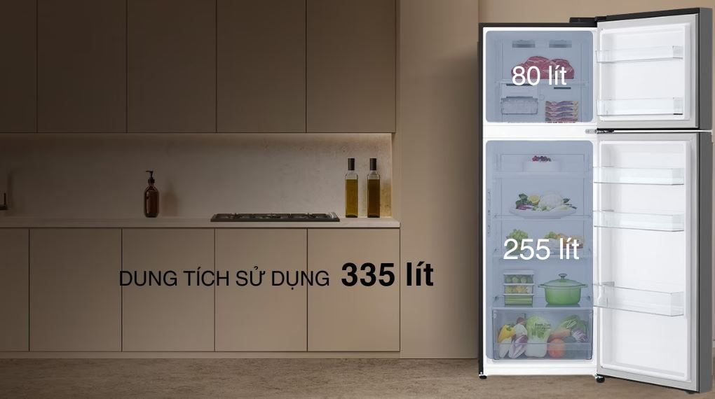 - Dung tích tủ lạnh LG 335 lít phù hợp sử dụng trong gia đình 3 - 4 người, đáp ứng tốt nhu cầu bảo quản thực phẩm đa dạng từ đồ tươi sống đến đồ uống và rau củ.