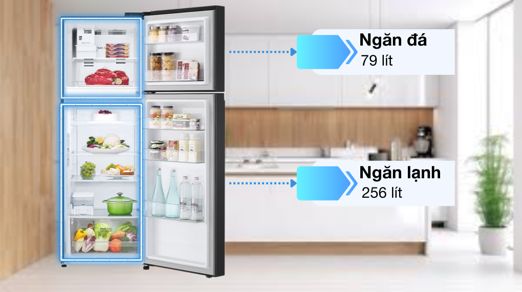 - Tủ lạnh có dung tích ngăn lạnh 256 lít giúp lưu trữ được nhiều thực phẩm, dễ dàng sắp xếp thực phẩm ngăn nắp.