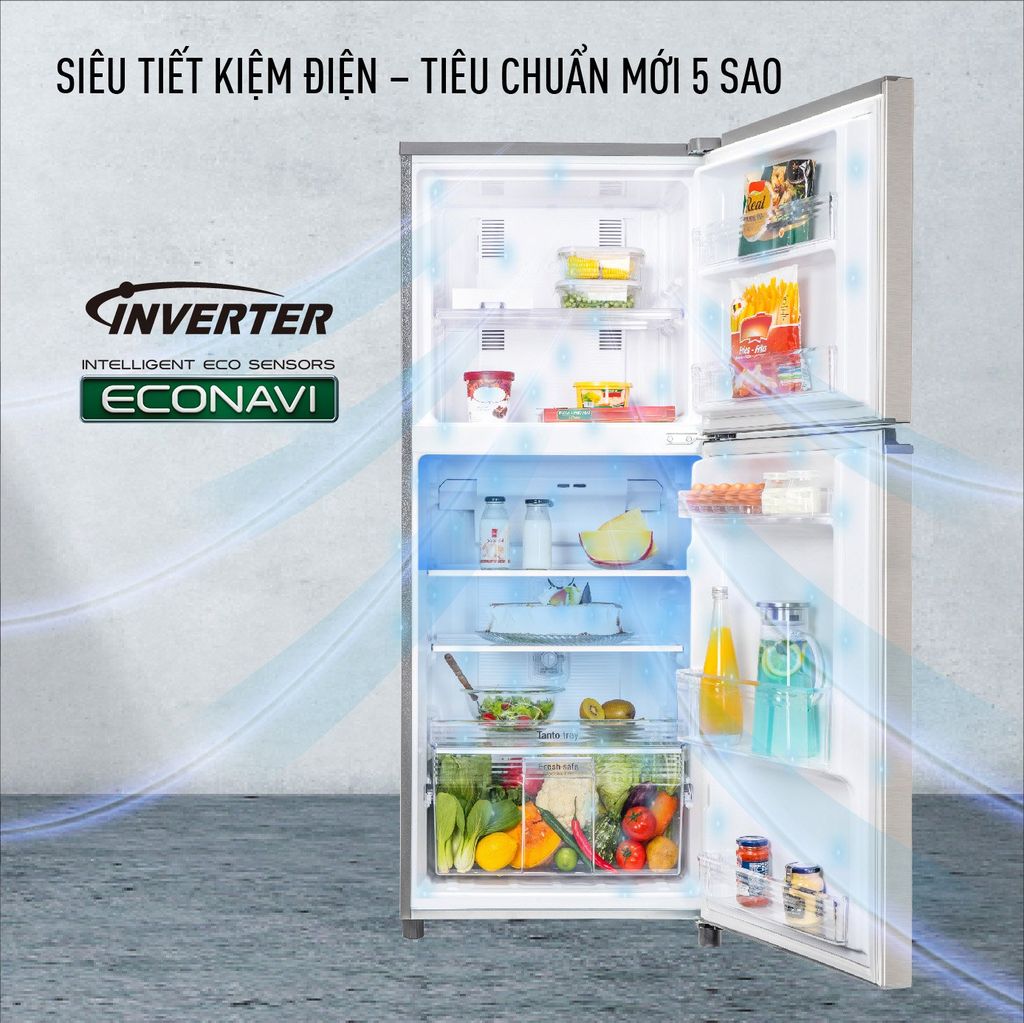Ba loại cảm biến ECONAVI giúp giám sát mức độ sử dụng tủ lạnh hàng ngày. Máy nén Inverter tối ưu hóa hiệu suất làm lạnh để giảm lượng điện năng tiêu thụ.