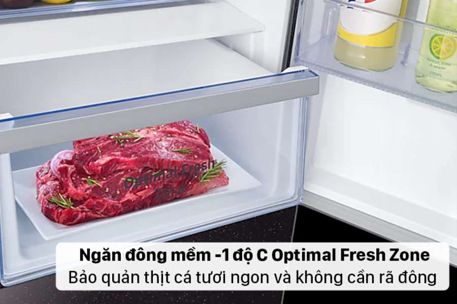 Tủ lạnh Samsung Inverter có ngăn đông mềm Optimal Fresh Zone được thiết kế riêng biệt dạng ngăn kéo với nhiệt độ chuẩn -1 độ C, phù hợp bảo quản thực phẩm tươi sống và không làm đông đá, đảm bảo dưỡng chất của thực phẩm. Đồng thời, người dùng không tốn thời gian rã đông mà có thể lấy ra chế biến ngay khi cần.