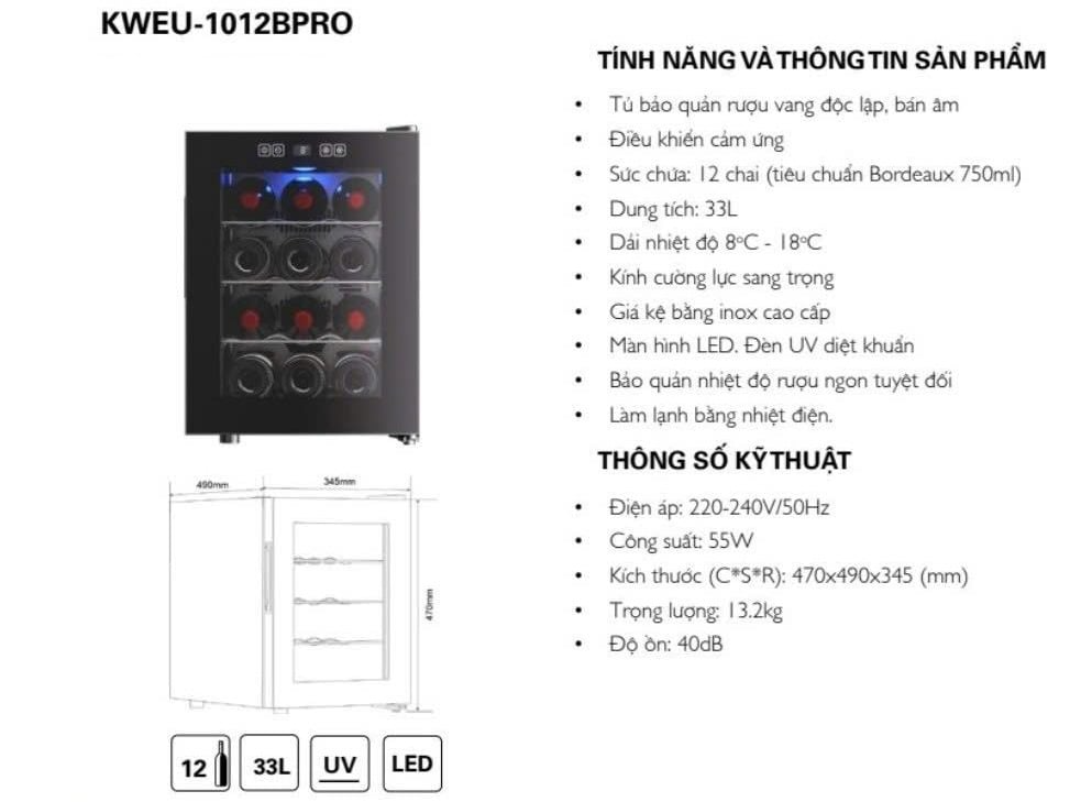 Tủ rượu vang Kocher KWEU-1012BPRO là lựa chọn lý tưởng cho không gian hiện đại với thiết kế sang trọng, sức chứa 12 chai và công nghệ tiết kiệm điện. Tủ bảo quản rượu hiệu quả với tính năng làm lạnh bằng nhiệt điện và điều khiển cảm ứng tiện lợi.